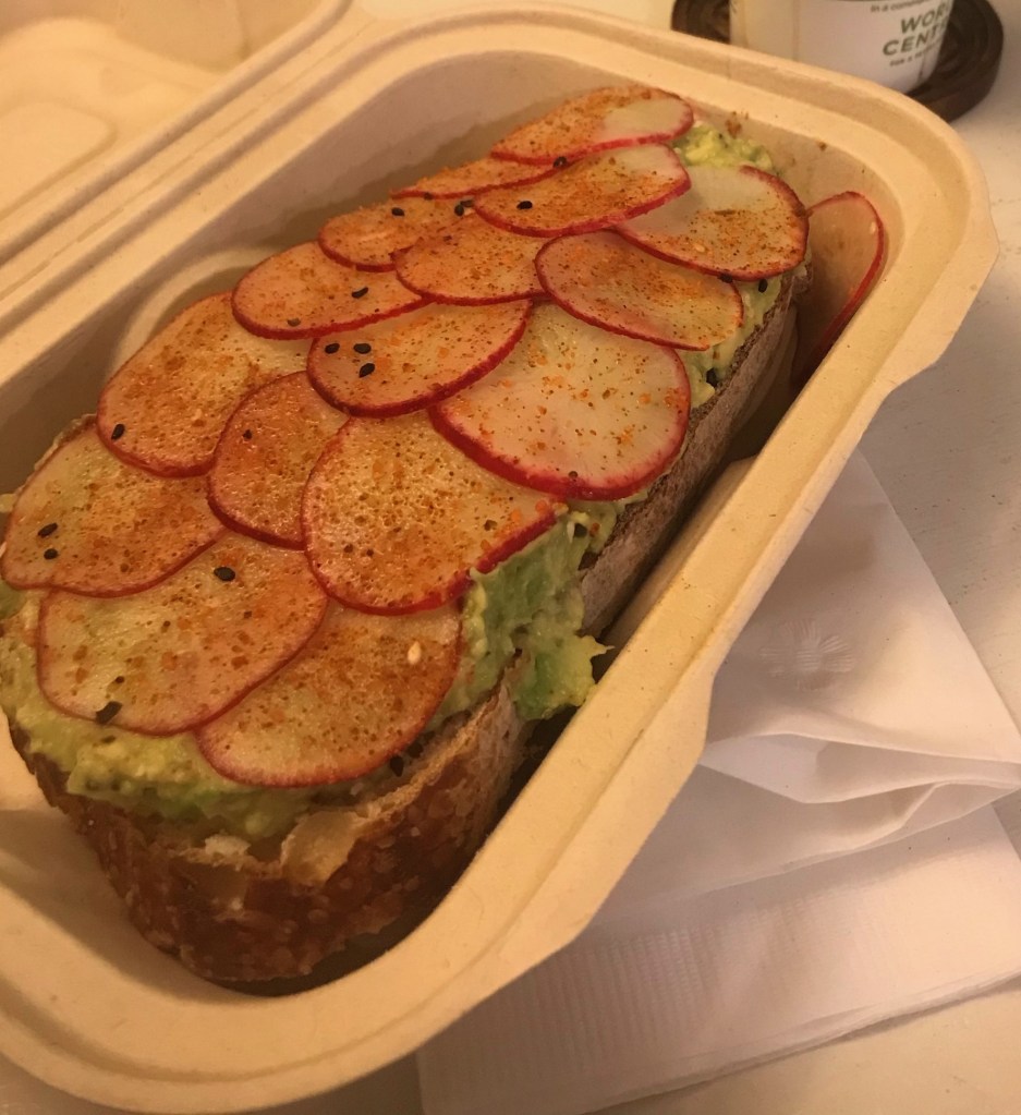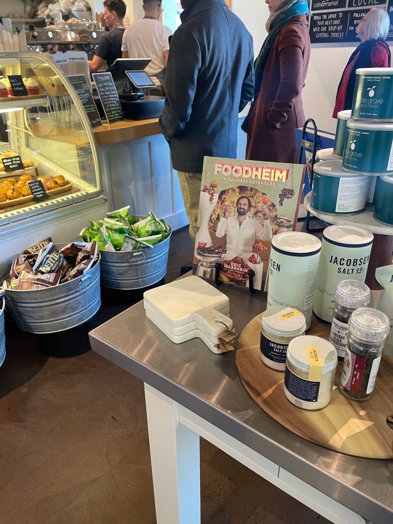 The Grove is located downtown and has a big parking lot, so parking is easy. The patio wasn’t open since it was still semi-cold in January, so we couldn’t dine outside with Poogie. I just went in and ordered take-out; the line was super long, I can imagine since it’s one of the only places open on Sundays. It has a pretty interior, very spacious and bright. I liked the book decoration on the center table ‘Foodheim’ by Eric Wareheim (he starred in the goofy Adult Swim series, Tim and Eric Awesome Show from the early 2000s). I ordered two coffees, avocado toast for me (my guilty millennial pleasure), and a breakfast sandwich for Scott. The staff there seemed to mainly consist of hip college students that were attentive but also too cool to be too attentive.