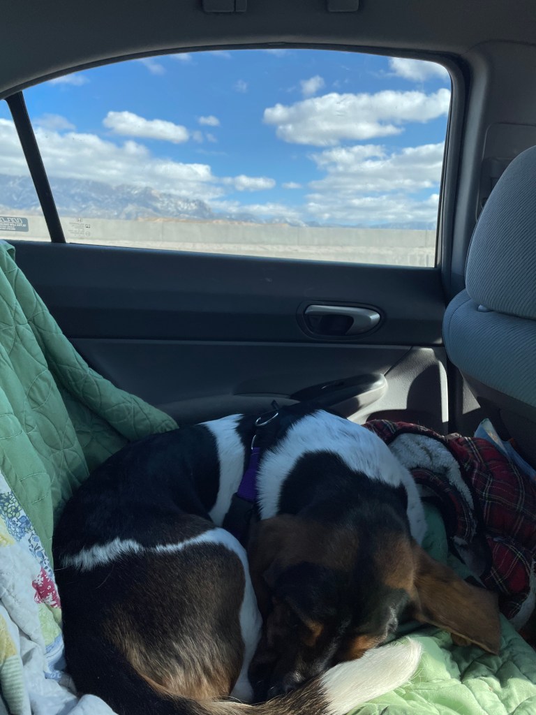 The photo on the right is my sweet Poogie taking a nap. When we first started driving with him, he would get very anxious and scared, but after several hours-long road trips, he’s used to it and now enjoys road trips. I sit in the backseat with him to keep him company while Scott drives.
