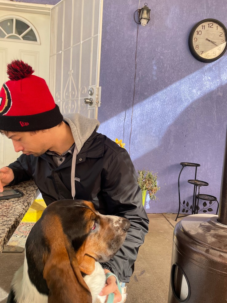 The weather in Albuquerque is a bit warmer than in Denver, but it was January, so when the wind blew, it was a bit chilly. The landscape was gorgeous – I loved all the cacti and the yellow flowers popping out of the cactus plants. Poogie is so low to the ground being a Bassett hound, we had to dodge him around the cacti so that he wouldn’t get poked by the thorns. (After the hike, we checked his ears, and he did end up having tiny cactus needles on his ears that we had to pull out.)