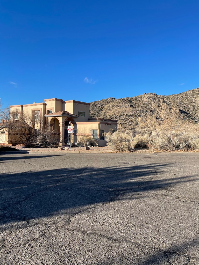 We found a trail near our Airbnb on the edge of a nice neighborhood, the City of Albuquerque’s Foothills Open Space. There are some gorgeous houses in that area, many of them have elements of the signature New Mexico adobe house, but bigger and grander. It was a short enough and easy hike to take Poogie on. We weren’t wanting to do a long hike, just enough to pass the time until we could get into our Airbnb, and enough to get a taste of the landscape.