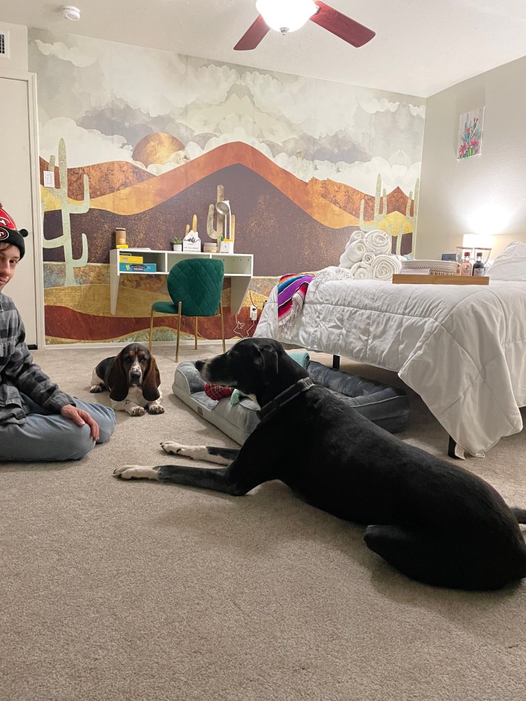 The host was dog-sitting the sweetest Great Dane and let him come over to our room to play with Poogie. She even let Poogie come over to her side of the house to hang with her and the dog, so all night they were wandering in and out of all sides of the house and running through the backyard.