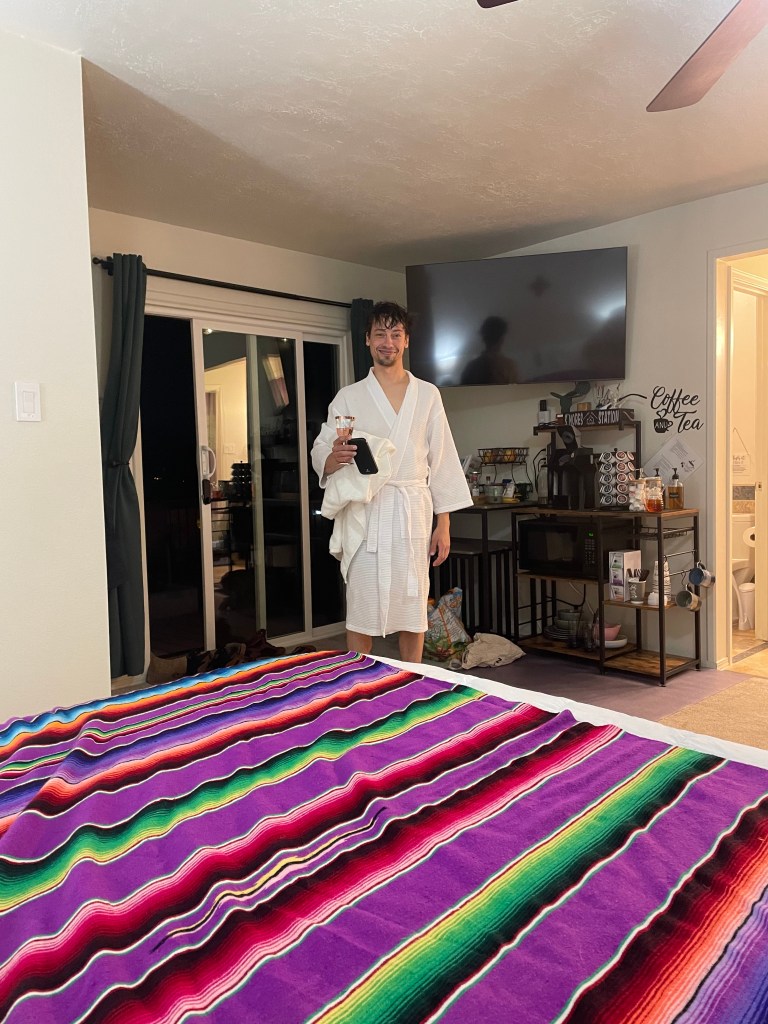 Scott took advantage of using the hot tub; I was too tired to join. He was totally in his best life mode with a glass of wine and wrapped up in one of the bathrobes that the host provided. I just relaxed on the comfy bed and watched Antiques Roadshow.