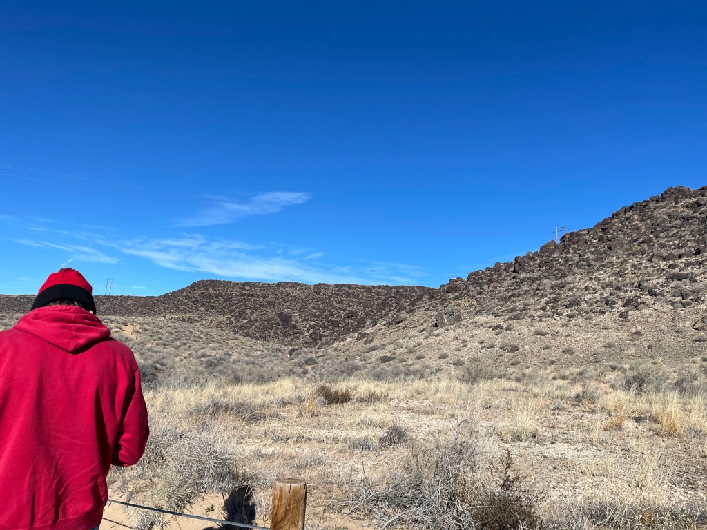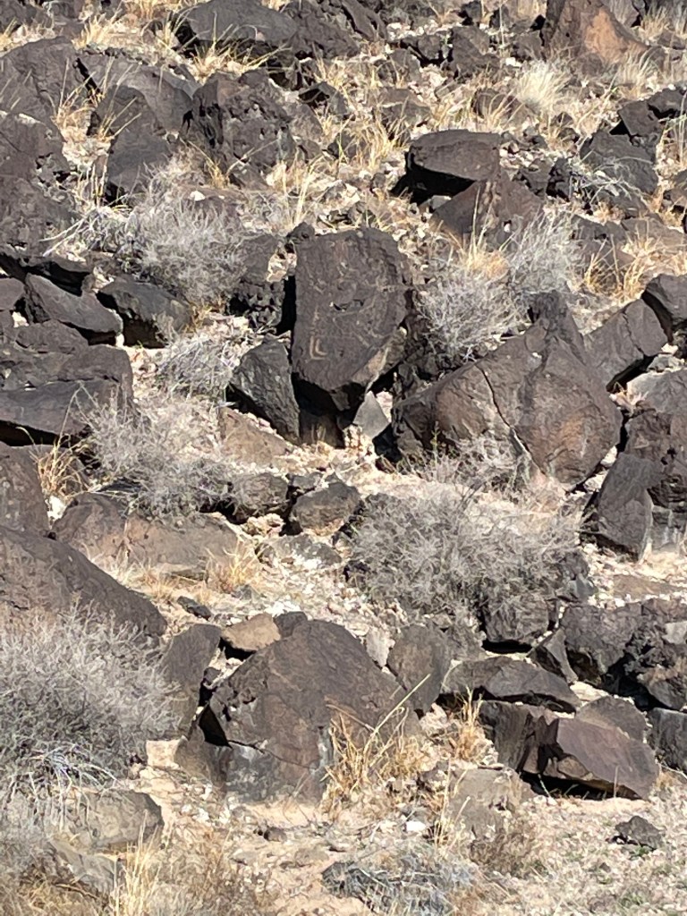 Here’s an expansive view of the volcanic-black rock to the right of the trail. The Petroglyphs don’t appear until a ways down the trail when the rocks become more and more prevalent, and you can see them up close.