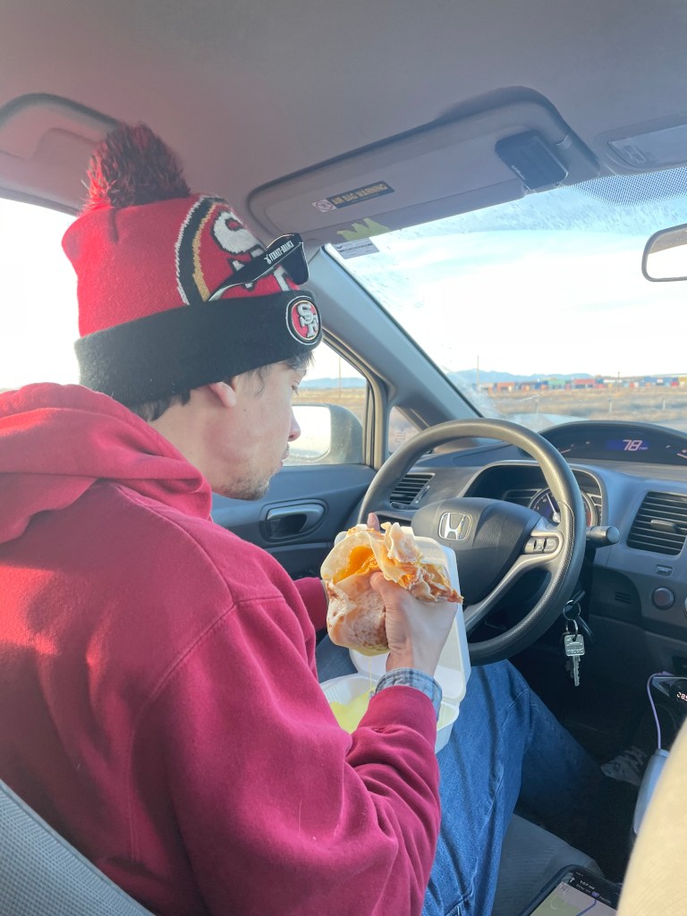 It took about 30 minutes until it was ready, and then we ate in the car on the way to our hike. The food was pretty good; it got us satiated and ready to hit the trail.